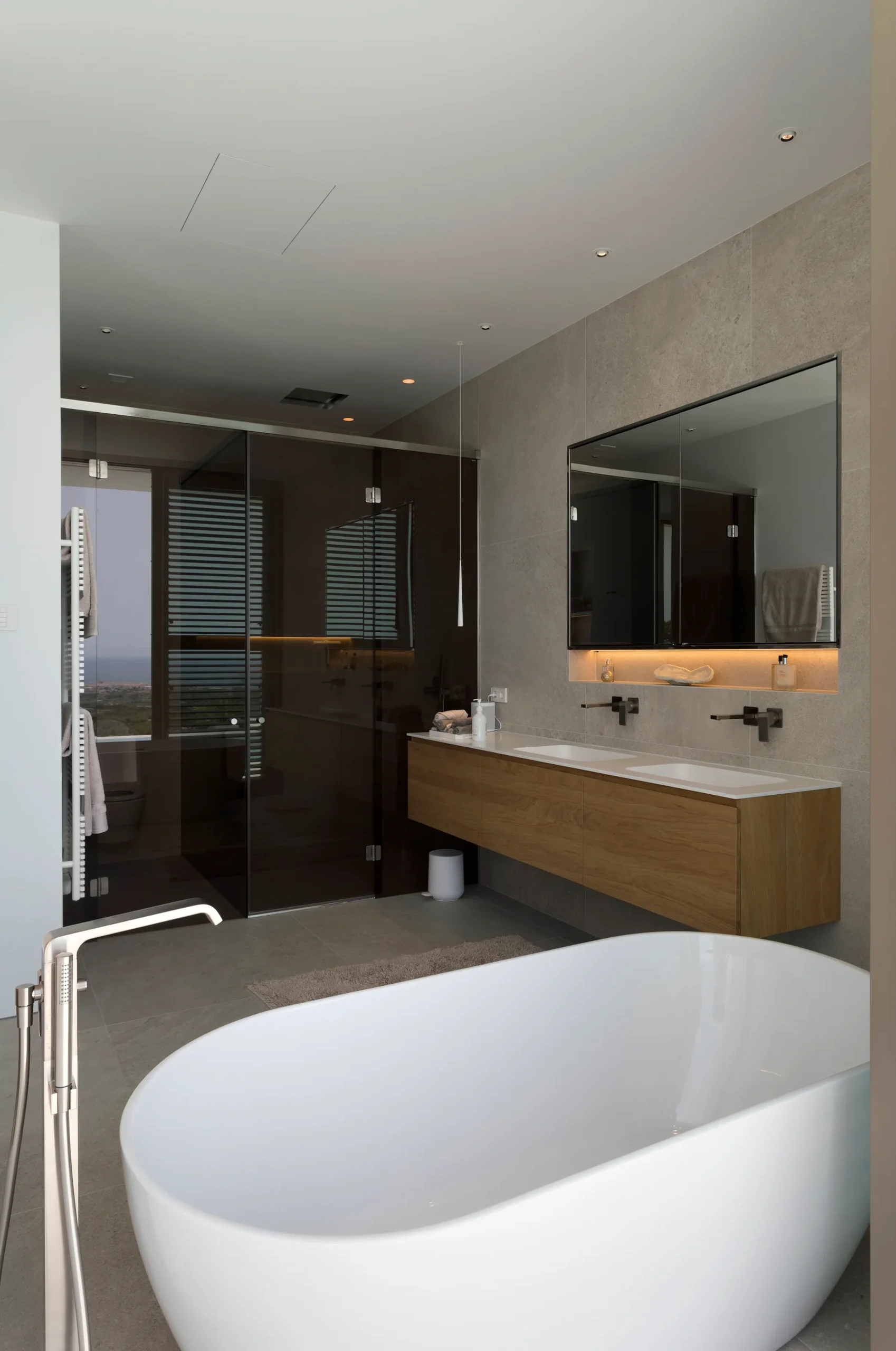 La arquitectura combina líneas modernas y materiales naturales, creando un equilibrio perfecto entre sofisticación y calidez. Grandes ventanales inundan los espacios interiores de luz natural y enmarcan las impresionantes vistas, transformando cada amanecer y atardecer en una obra de arte.